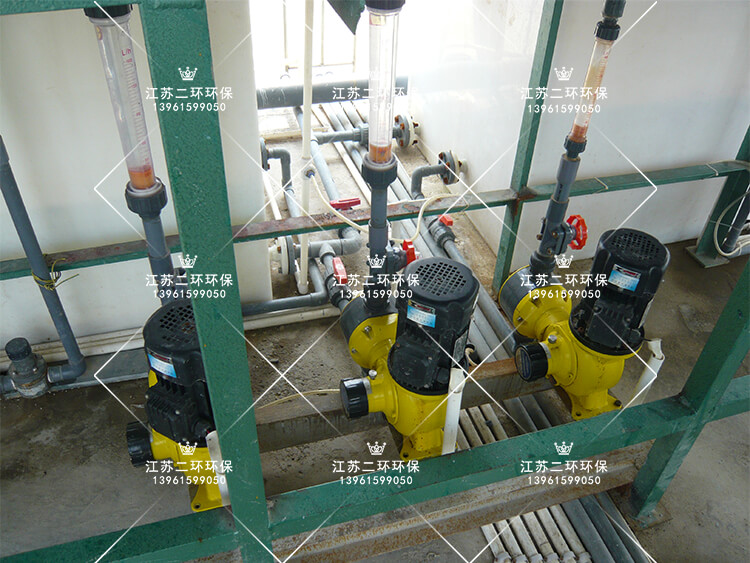 3、一級(jí) pH 調(diào)節(jié):污水由泵進(jìn)入一級(jí)調(diào)節(jié)槽(機(jī)械攪拌),由 pH 自動(dòng)控制儀控制投藥計(jì)量泵投加 NaOH,將廢水的 pH 值調(diào)至工藝設(shè)定值。