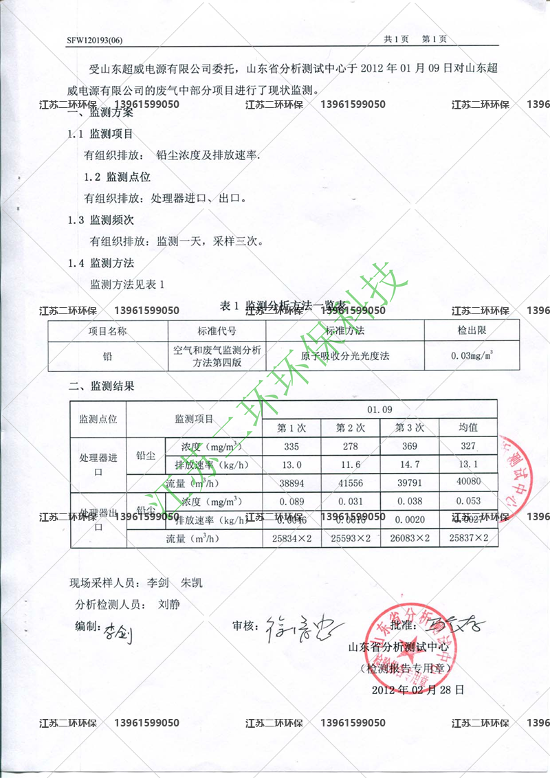 4、排放濃度≦0.1毫克/立方米型:河北超威電源有限公司(股票代碼:超威動(dòng)力HK00951)出廠前檢測(下圖)